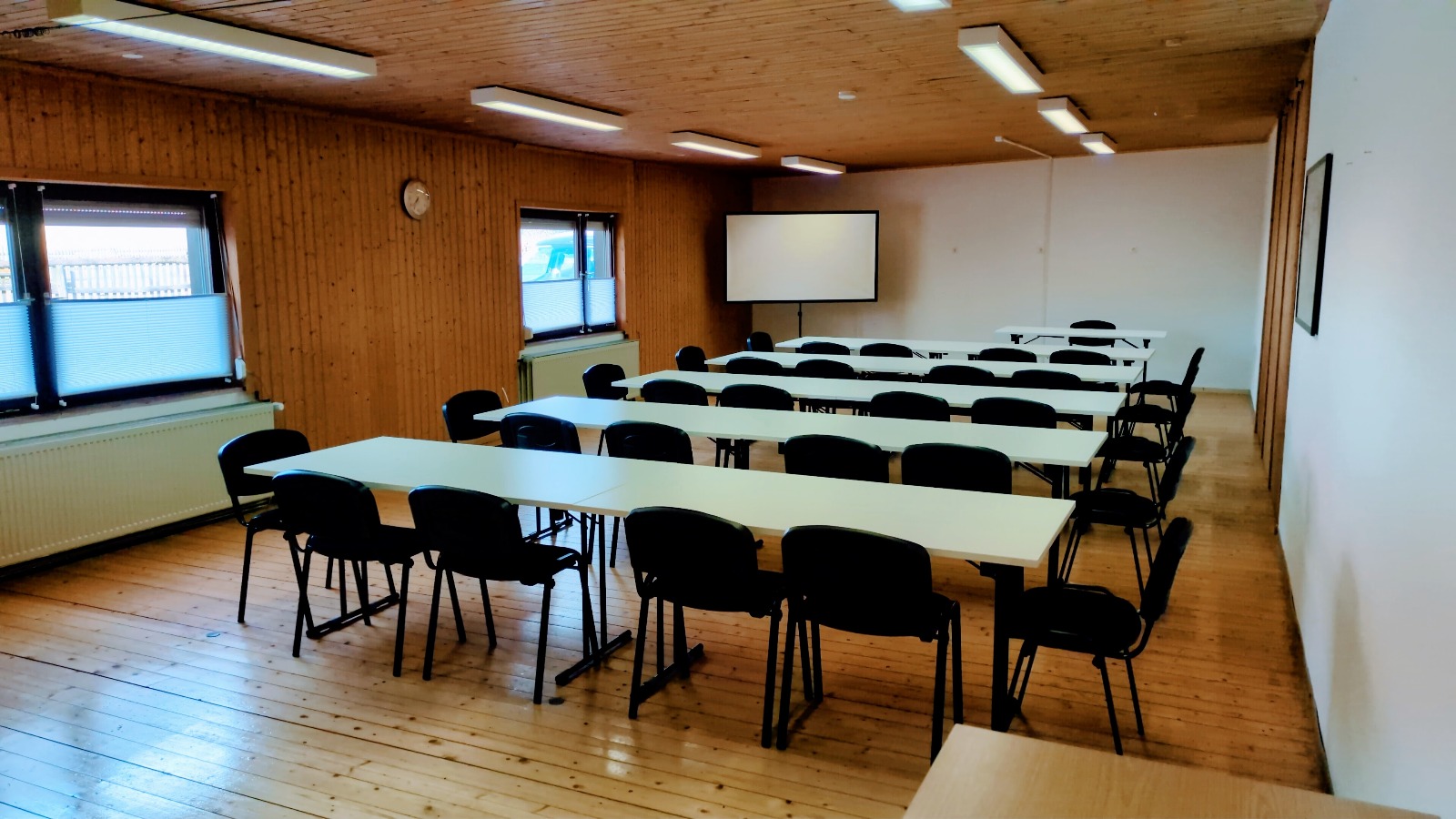 Der Seminarraum ist komplett eingerichtet mit Tischen und Stühlen, einem Rednerpult sowie einer Leinwand mit Beamer. Hier finden bis zu 40 Personen Platz. Der Seminarraum ist barrierefrei zugänglich. Eine Abdunklung des Raums ist bei Bedarf möglich. Toiletten sind vorhanden.